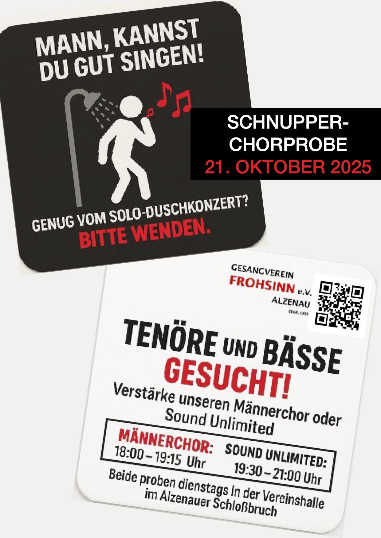 Wir freuen uns auf viele Besucher im Rahmen unseres Konzertes am 08.10.2022 im Schlösschen Michelbach. Karten sind erhältlich bei allen Sängerinnen und Sängern, in der Altstadtbäckerei Christ oder unter konzertkarten@frohsinn-alzenau.de.